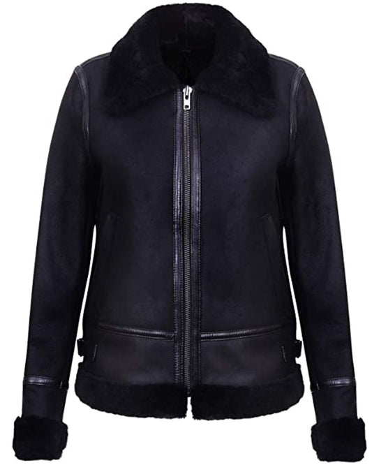 New Black Sheepskin Shearling B3 RAF Aviator Cowhide Leather Jacket For Women
