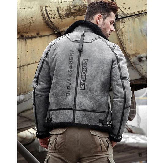 New Men B3 Bomber Grey Sheepskin Shearling Leather Jacket