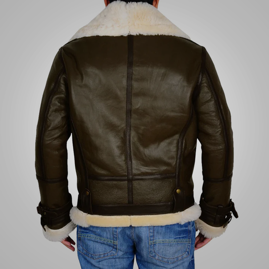 New Men Sheepskin Shearling Army Green B3 Bomber Genuine Leather Jacket
