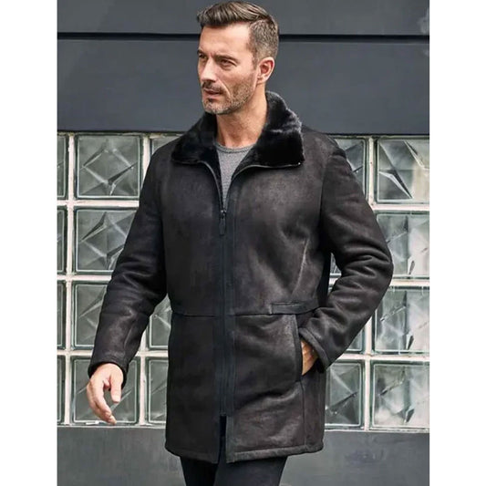 New Black Sheepskin Shearling Fur Outwear Mink Overcoat Lapel Leather Jacket Coat For Men
