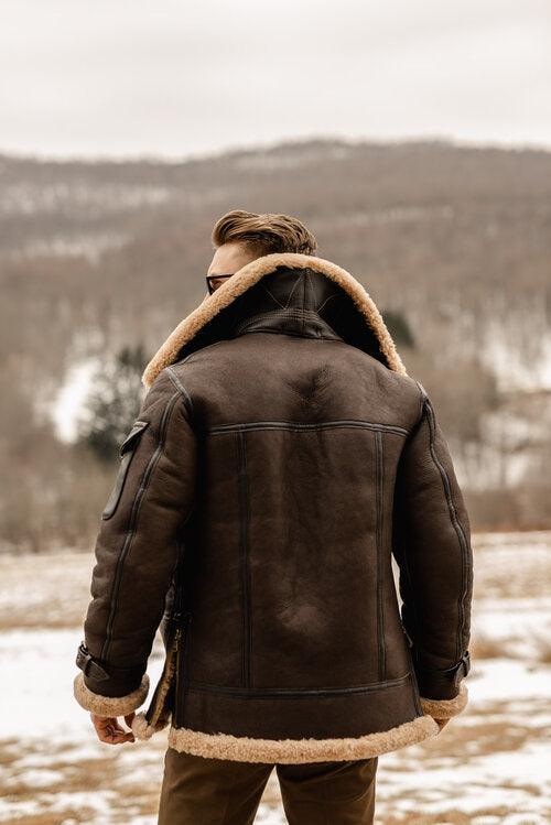Mens Brown RAF Aviator Sheepskin fashion B3 Bomber Genuine Leather Jacket