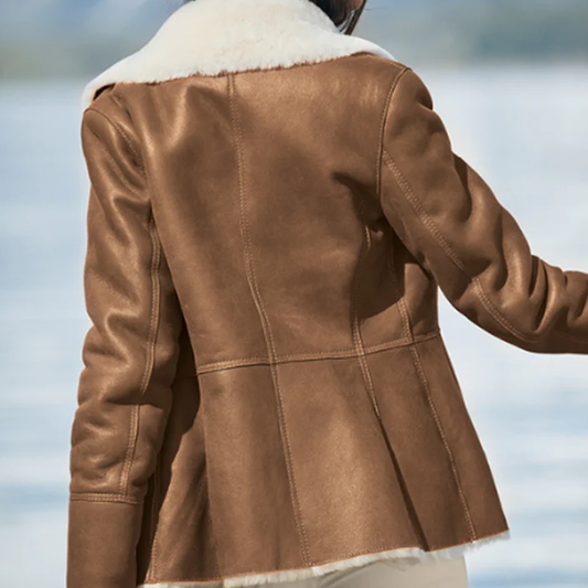 Sheepskin Women's Leather Shearling Jacket in brown color.
