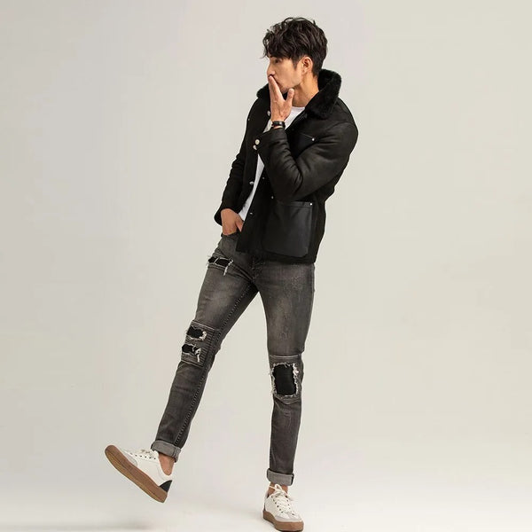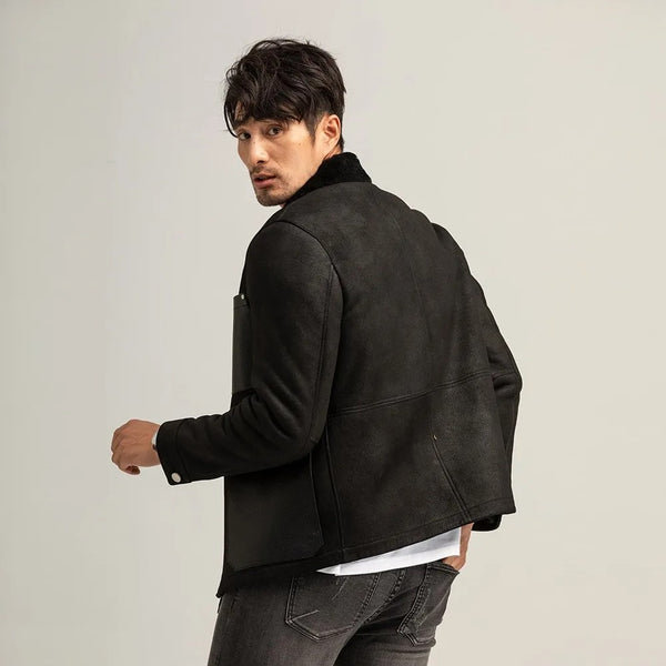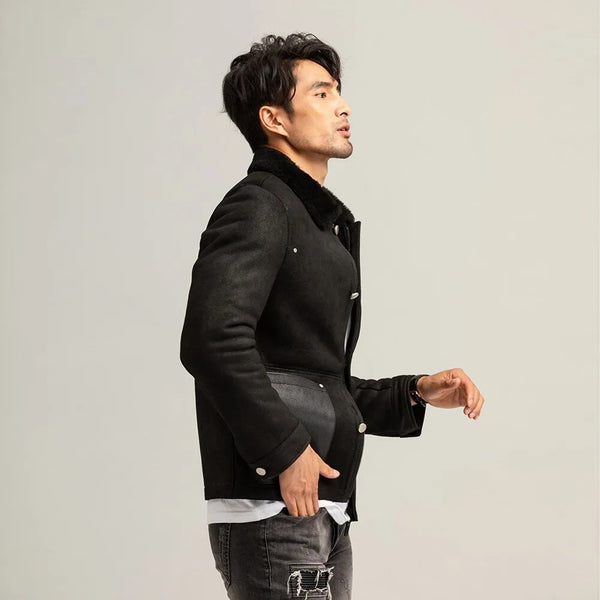 This stylish shearling suede jacket is designed for colder temperatures. Crafted from high-quality sheepskin, it's guaranteed to keep you warm and comfortable in the winter months. With its sleek black hue, this shearling jackets timeless design will remain fashionable for years to come.