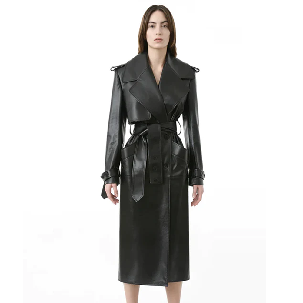 New Black Sheepskin Fitted Leather Trench Coat For Women