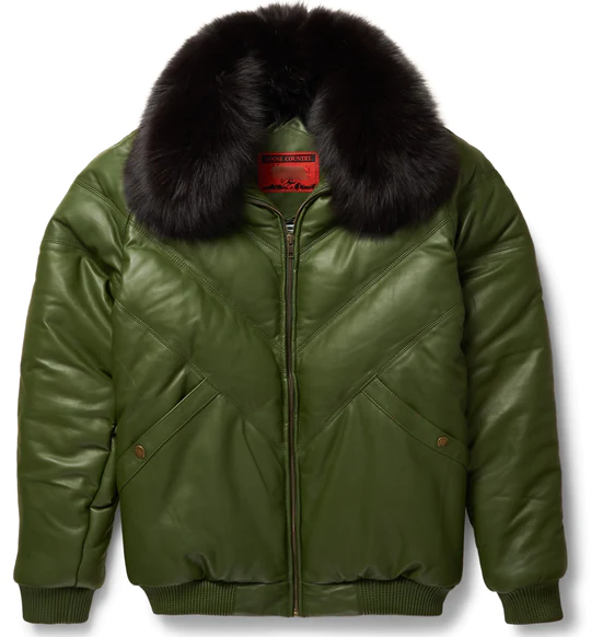 New Olive Leather V-Bomber Jacket For Men With Black Fur Collar