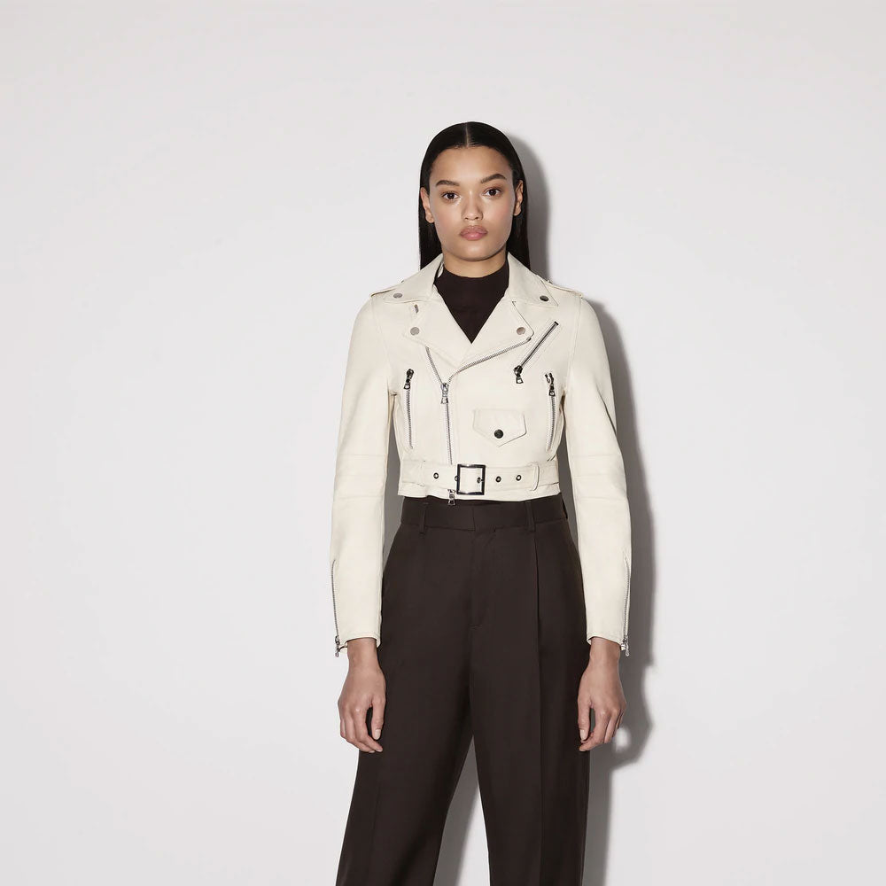New white Women Sheepskin Aviator Motorcycle Genuine Leather Biker Jacket