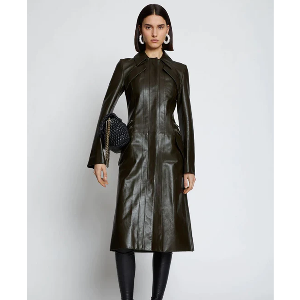 New arrival is here and with it comes, Dark Green Slim Fit Leather Long Trench Coat. Darker color and often more liked so why not have a dark color women's trench coat? Buy the best 2022 leather trench coat now!