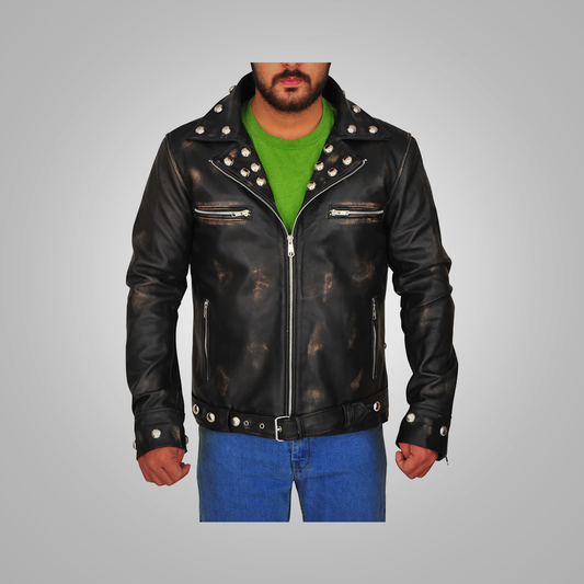 New Mens Sheepskin Studded Distressed Genuine Leather Biker Jacket