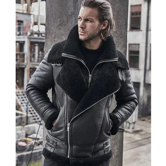New Men B3 Bomber Grey Sheepskin Shearling Leather Jacket