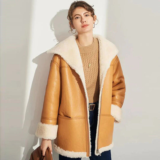 New Dark Brown Sheepskin Shearling B3 RAF Aviator Styled Leather Jacket For Women